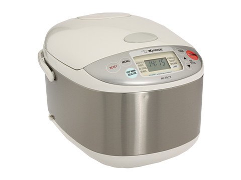 Enjoy delicious rice anytime, cooked automatically to your preference. Compact design with a stainless steel finish complements the modern kitchen. Spherical heating system and cooking pan assures even heat distribution for perfectly cooked rice every time. 10-cup capacity is perfect for larger families or parties and gatherings. Note: Capacity is stated in 6 oz. cups of raw rice. Cooked yield is roughly double the amount. Features automatic keep warm cycle. Menu settings include: white/mixed porridge sushi sweet brown quick cooking. Rice cooker can also be used to bake small cakes for those special occasions. Easy-to-read LCD control panel with clock and timer display. Measuring lines on inner cooking pan for precise control of ingredients. Removable inner cooking pan makes clean-up a breeze. Convenient detachable inner lid allows easy washing. Retractable power cord keeps your counter top clutter-free. Comes with a rice measuring cup and a rice spatula with holder. Dimensions: 10.3w x 7.5h x 14.5d. 120 volts/820 watts. Zappos makes every attempt to provide accurate information for each electronic product. Manufacturer packaging and specifications may be different from the information provided. Please note, Zappos gladly accepts returns on all electronic products for up to 365 days from the original purchase date. In order to process your return and refund, returned electronic products must be unused and in the original condition and packaging in which it was purchased and include any manuals, cabling and accessories.